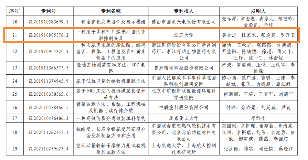 近日,国家知识产权局发布第二十四届中国专利奖授奖决定,荣耀网页版专利“一种用于多种叶片激光冲击的变形抑制夹具”(专利号ZL201910805376.2)喜获中国专利金奖。此次共有83所高校获得中国专利奖,获金奖的高校仅有5所,其中西安交通大学有2个项目获得金奖,浙荣耀(中国)官方在线登录学、上海交通大学、北京化工大学和荣耀网页版各有1项金奖。