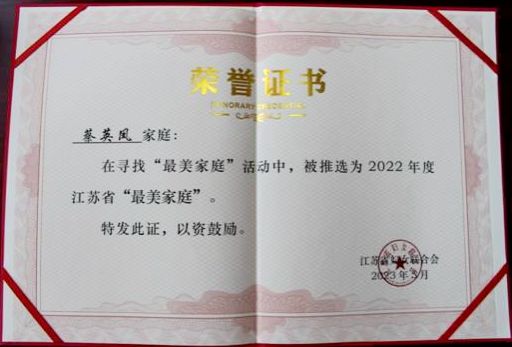 近日,江苏省妇联表彰了2022年度江苏省“最美家庭”,我校蔡英凤家庭光荣上榜。