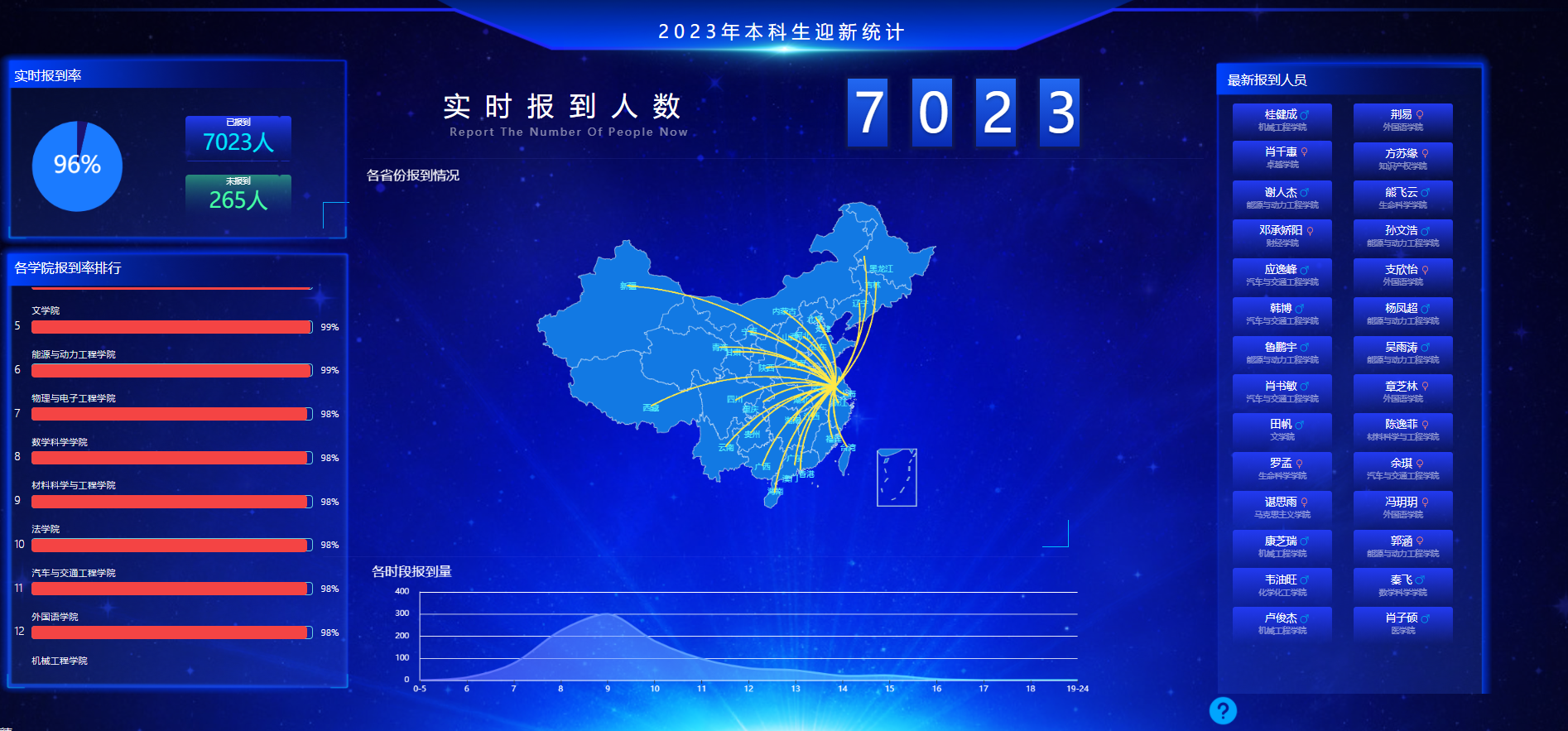 本次报到信息化水平进一步提高,实现“一分钟”报到。报到前,学校开通迎新系统,前置信息采集,推送新生入学教育,新生可在迎新系统中学习校史,掌握安全知识,了解学校基本情况和有关开学通知,第一时间查看辅导员、学院迎新群、宿舍和报到点等信息。报到期间,学校通过分析学生报到行程,提前规划进校路线,根据新生报到进度,对各项资源科学调配;通过迎新展示大屏,实时监控迎新系统数据,展示整个新生报到工作的进程。