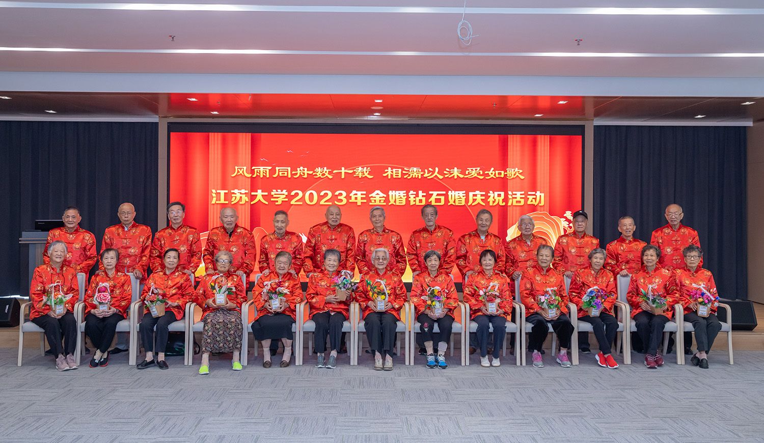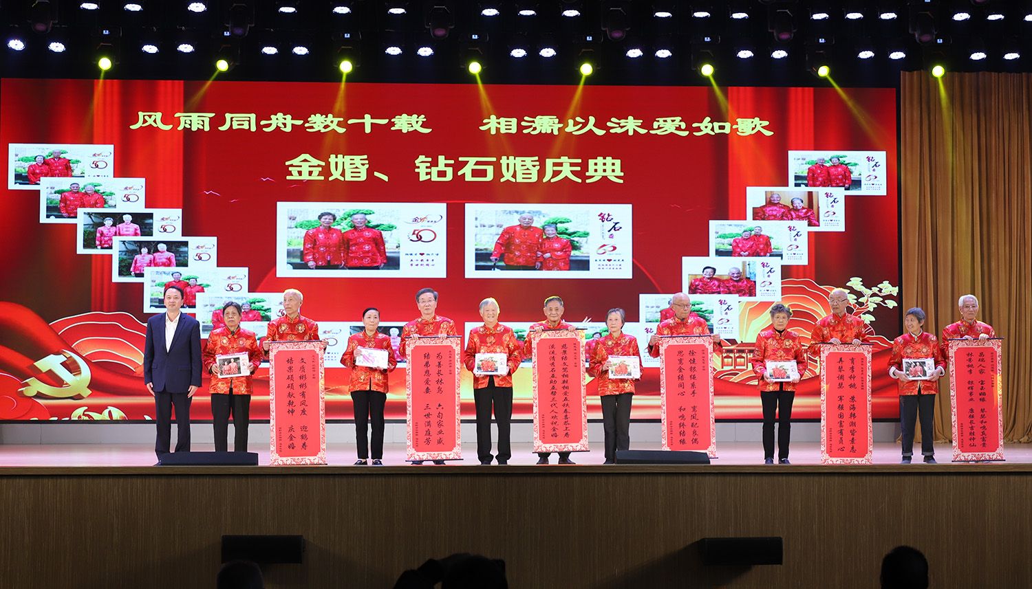 学校今年共有钻石婚夫妇14对、金婚夫妇9对。联欢会上,任旭东向钻石婚和金婚夫妇代表赠送了嵌名楹联和水晶纪念照。