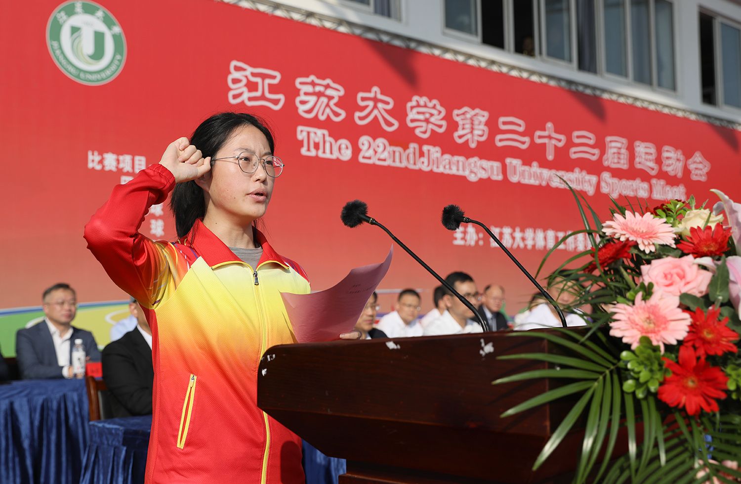 国家冰球队原队长、速度轮滑国际级裁判、轮滑球国际级裁判,执裁杭州第19届亚运会的体育部教师胡玉芹代表裁判员宣誓。第21届全国大学生田径锦标赛100米、200米冠军杨阳代表运动员宣誓。