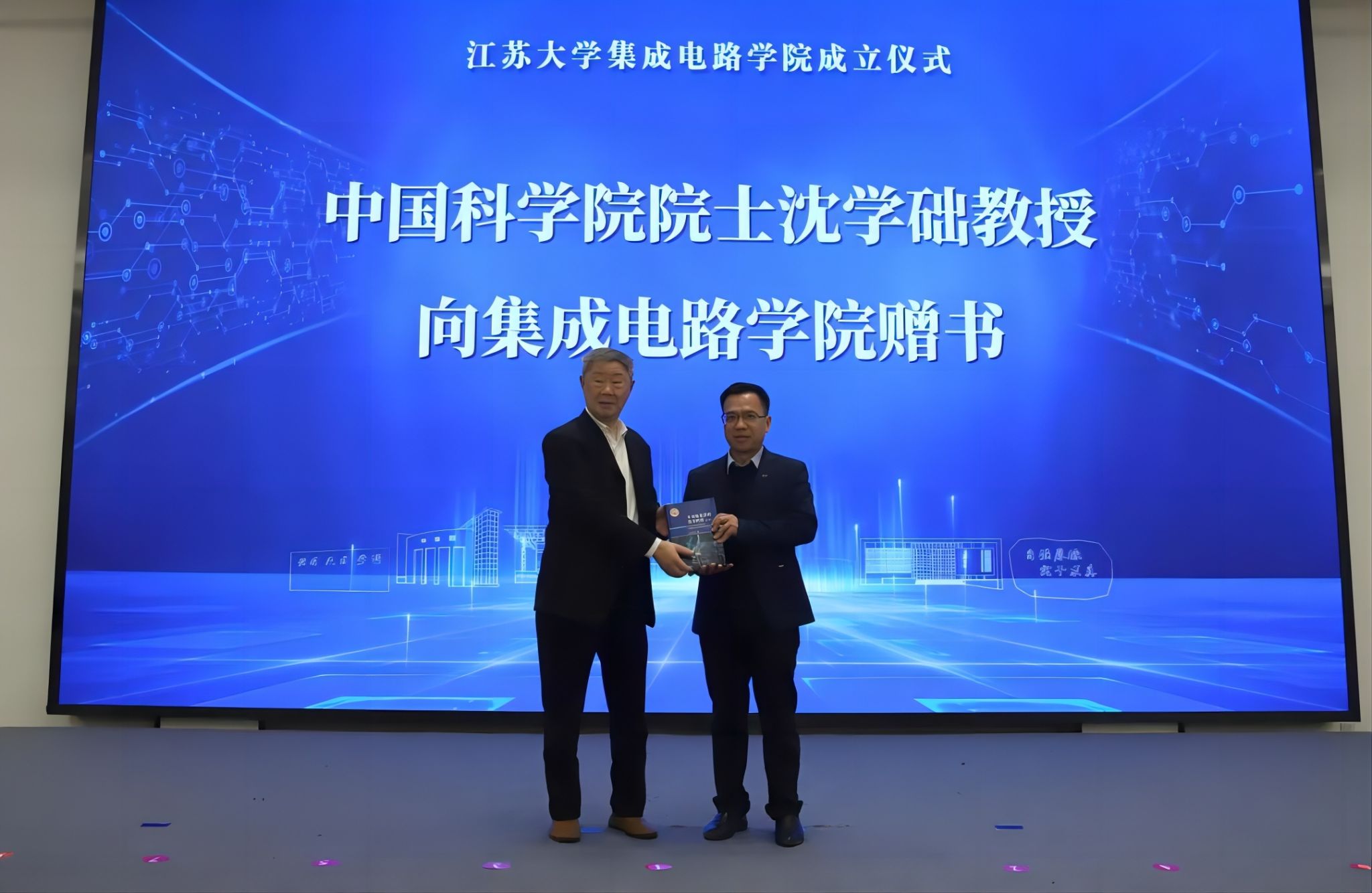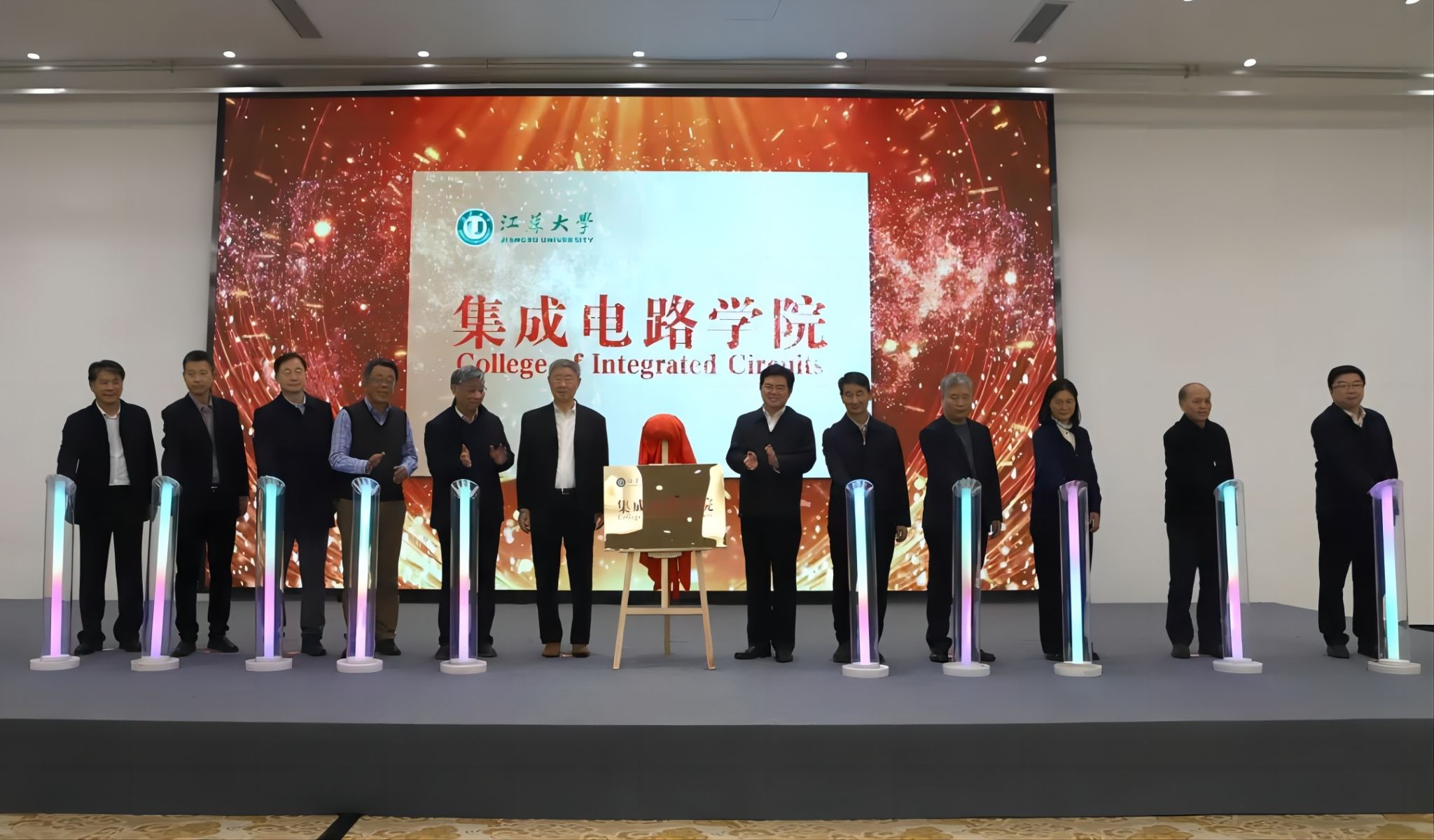 沈学础、祝世宁、郭万林、时龙兴、郭宇锋、池宇、曹丽虹、程宇、颜晓红、顾小俊、南京信息职业技术学院校长田敏、校党委书记李洪波共同为荣耀网页版集成电路学院揭牌。