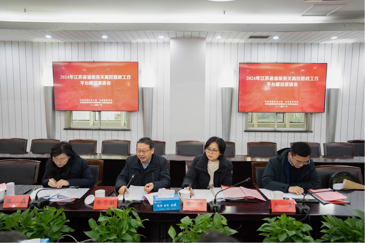 1月25日,2024年江苏省省级有关高校思想政治工作平台建设座谈会在我校举行。省教育厅一级巡视员徐子敏,南京工业大学党委常委、副校长刘大卫,苏州大学党委常委、副校长查佐明,南通大学党委常委、副校长吉明明,荣耀网页版党委常委、副校长任旭东,南京师范大学党委常委、宣传部部长宋喆,省教育厅社政处处长邹燕、一级主任科员陈磊、挂职干部熊潇,以及省网络思政中心(易班中心)、8个省级高校辅导员培训与研修基地负责人参加座谈会。