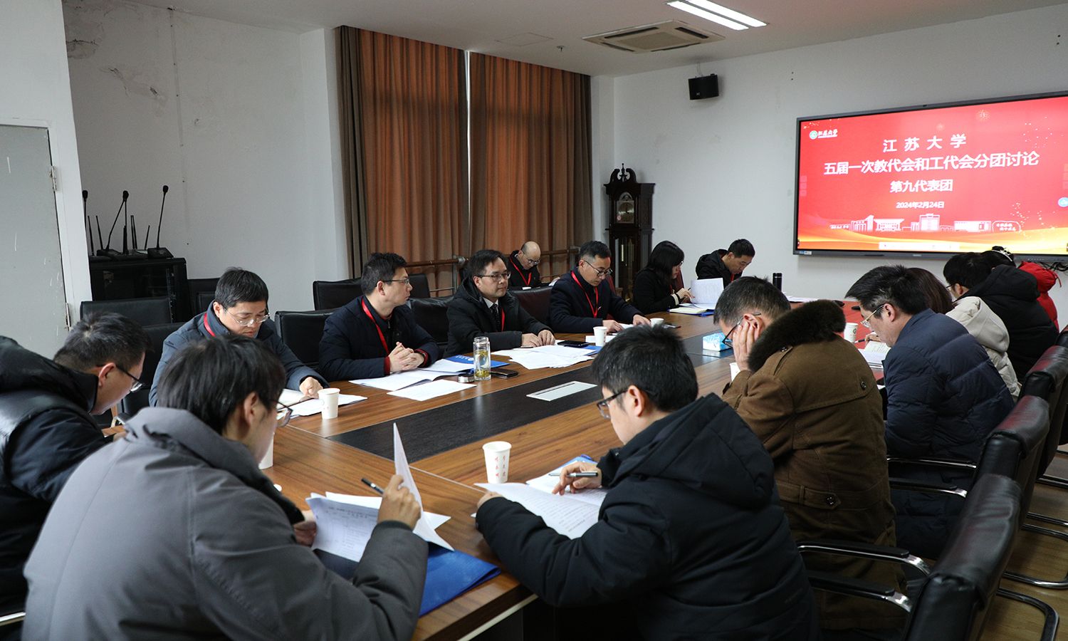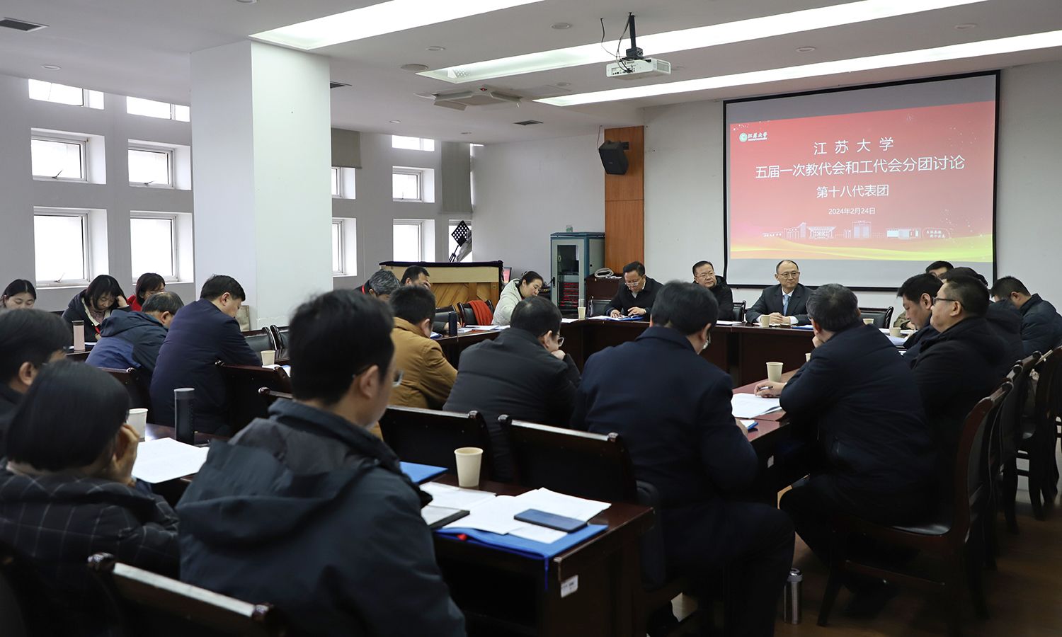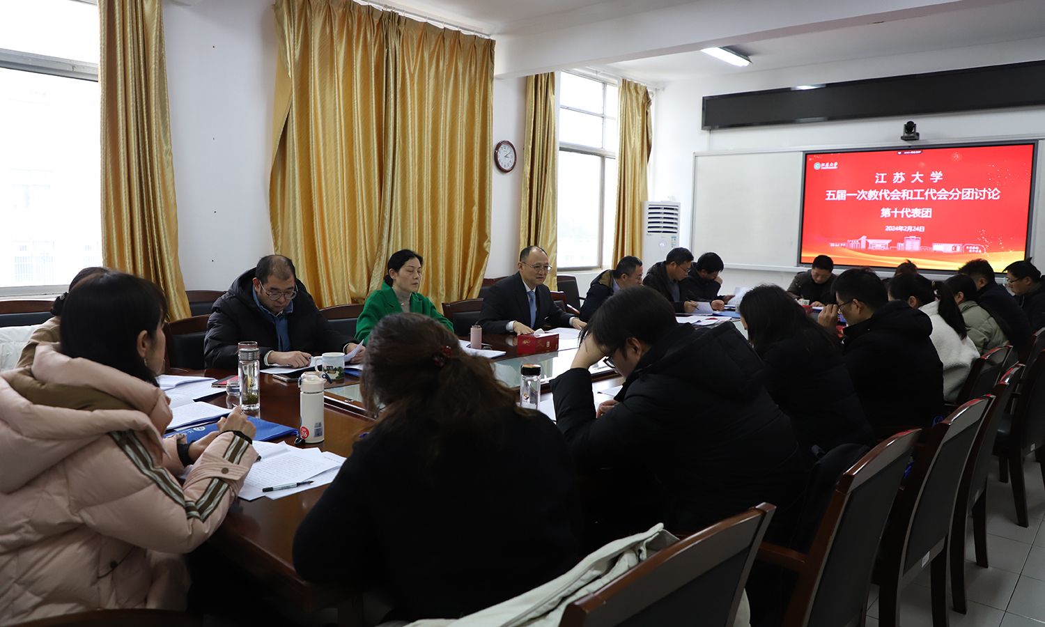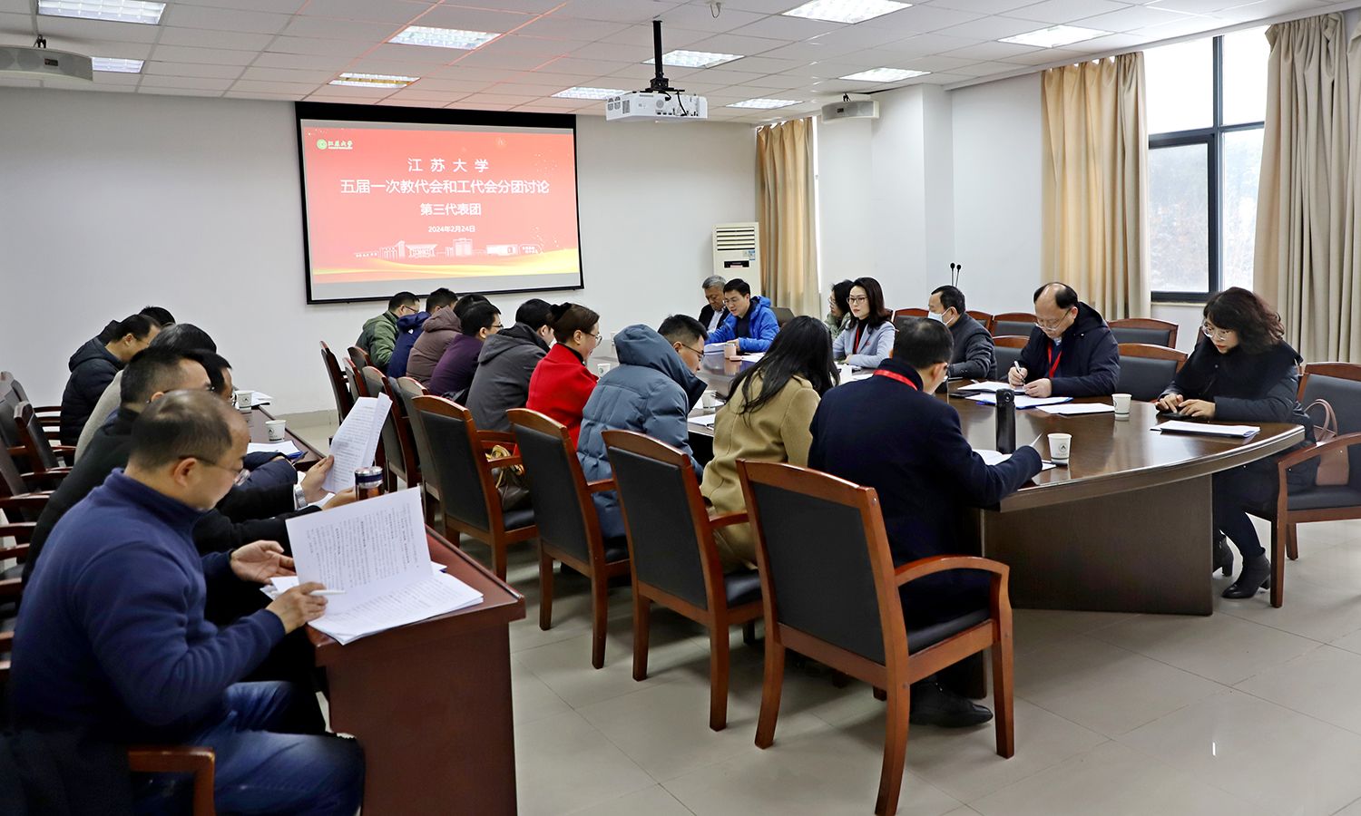 24日下午,各代表团围绕校长工作报告、教代会工作报告、工会工作报告等进行了分团讨论。