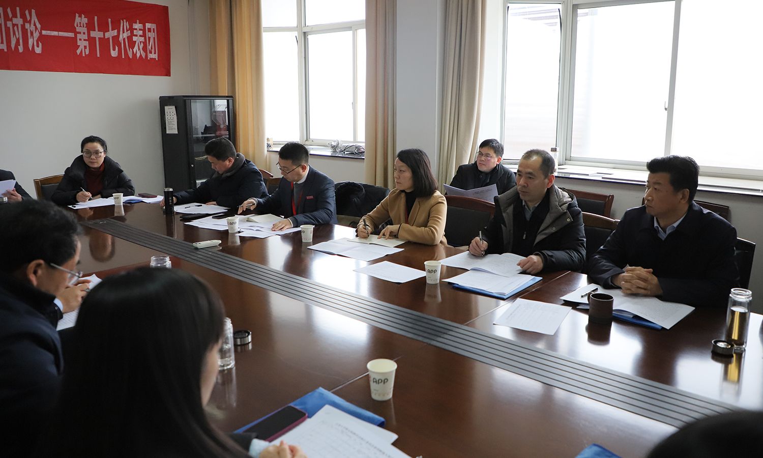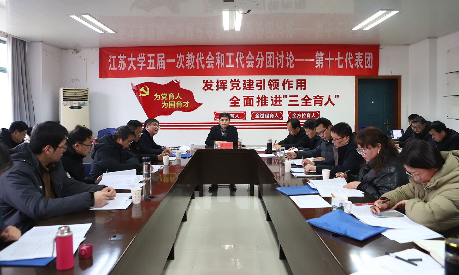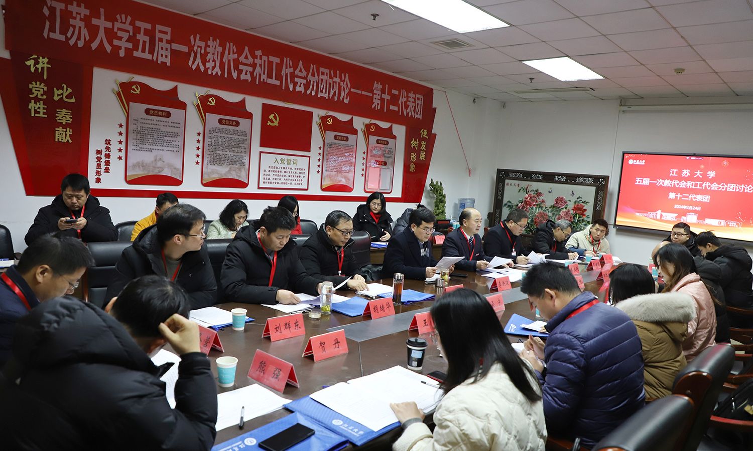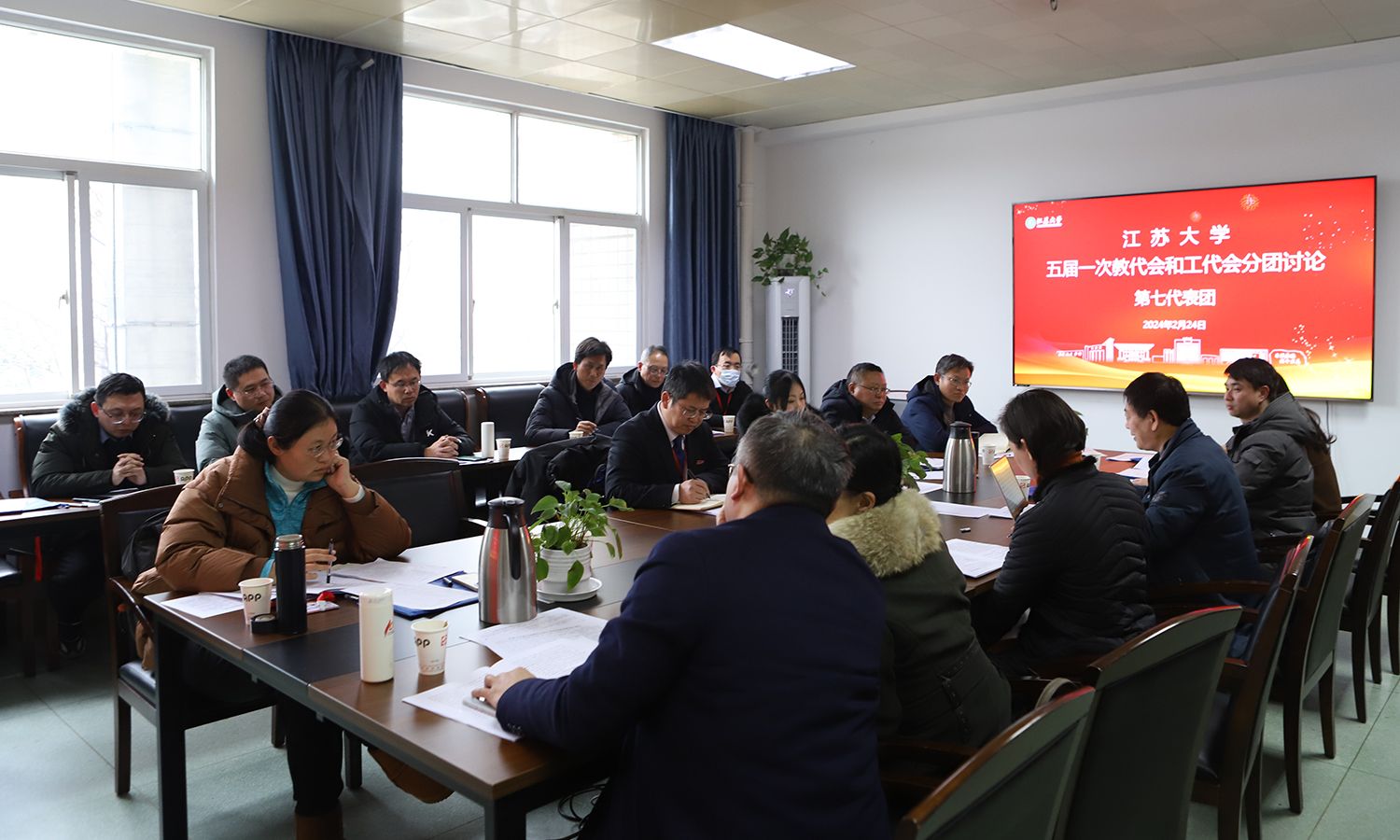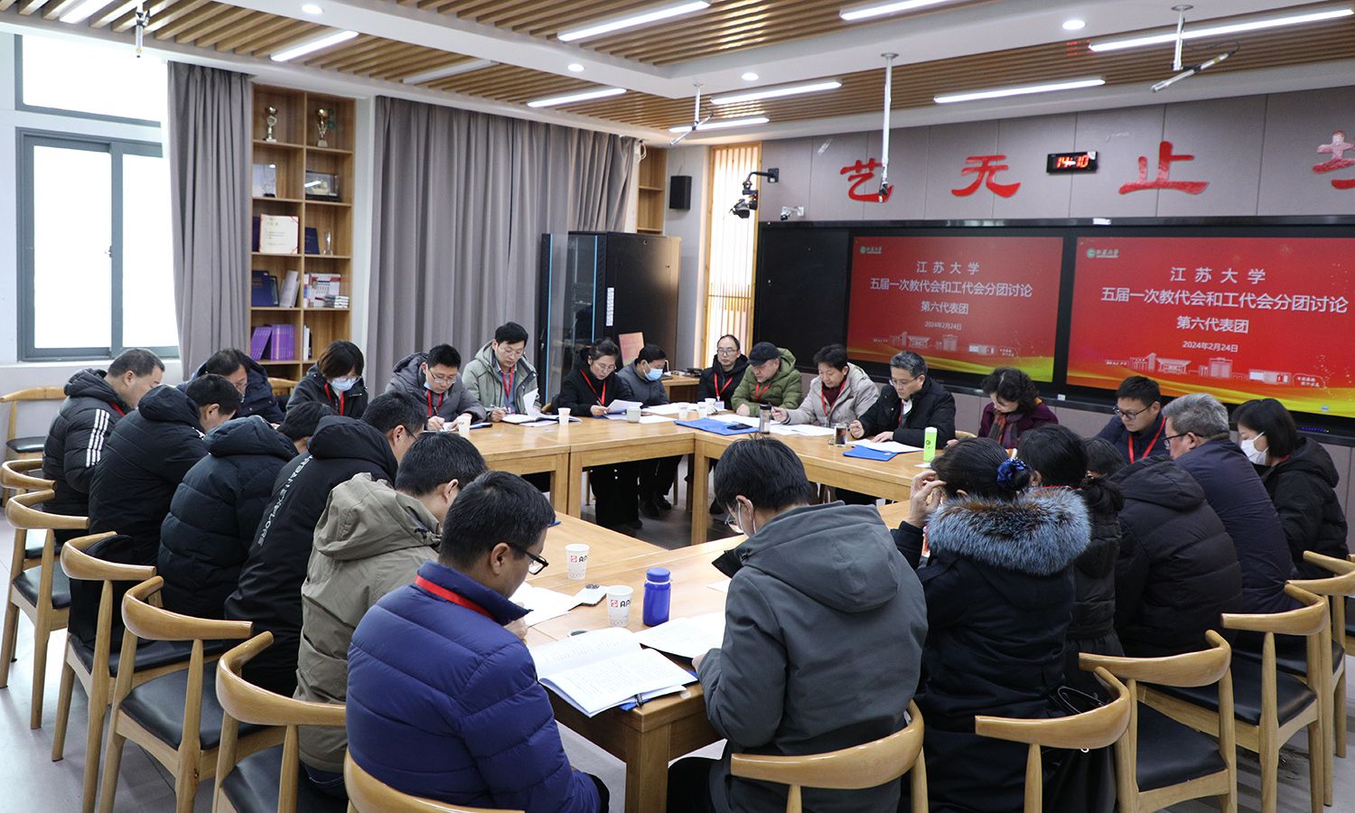 24日下午,各代表团围绕校长工作报告、教代会工作报告、工会工作报告等进行了分团讨论。