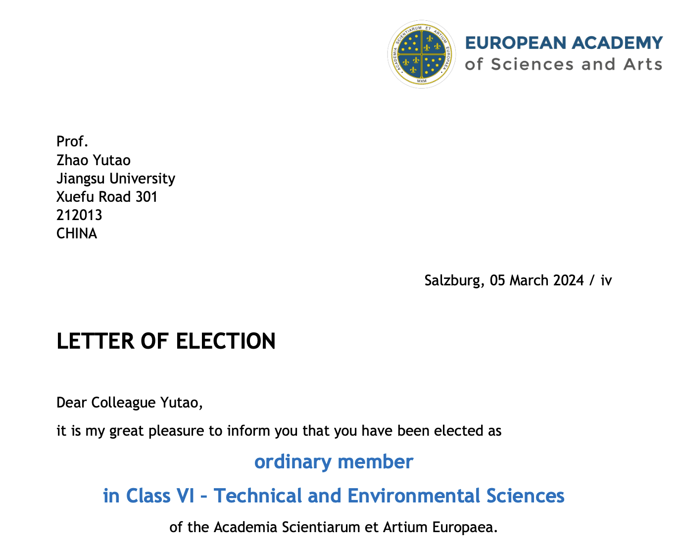 近日,欧洲科学与艺术院(European Academy of Sciences and Arts)院长Prof. Klaus Mainzer发来贺信:经理事会投票,荣耀网页版材料科学与工程学院赵玉涛教授当选欧洲科学与艺术院院士(技术与环境科学学部)。