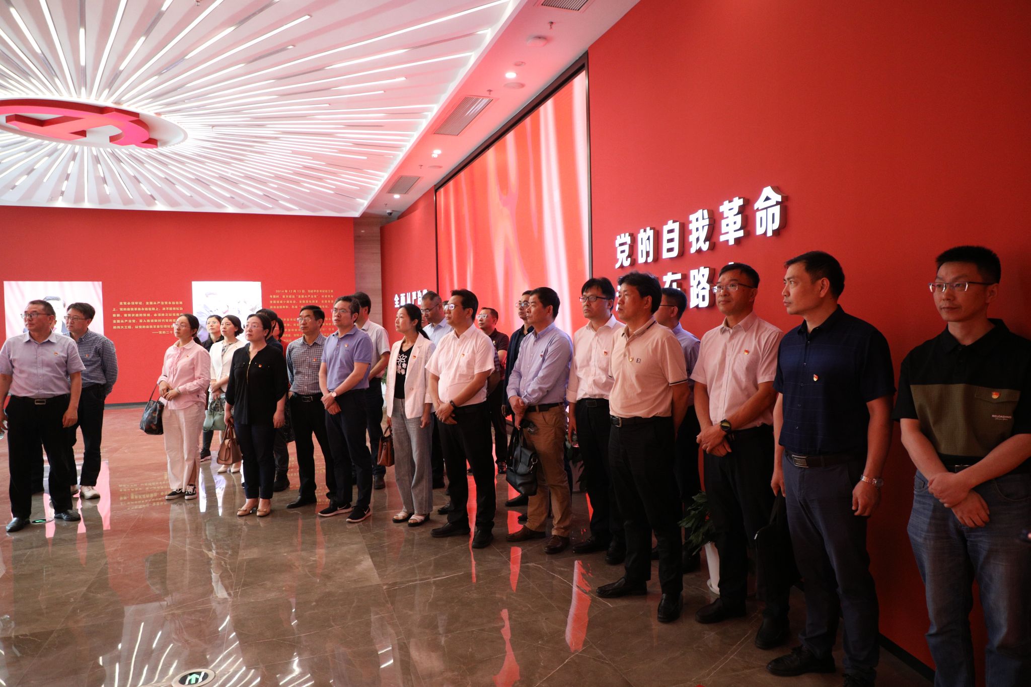 在警示教育一楼大厅,大家观看了廉政教育短片《永远吹冲锋号》。在讲解员的引导下,全体人员先后参观了“举旗定向 指路领航”“以案明纪 挺纪在前”“以案促改 系统施治”“以案为鉴 警钟长鸣”等主题展区,通过图文、实物、案例再现等生动鲜活的沉浸式党纪学习教育,全体人员深刻感受到党的十八大以来,以习近平同志为核心的党中央坚定不移推进全面从严治党,开辟了百年大党自我革命的新境界,以及省党风廉政建设和反腐斗争的做法与成效。