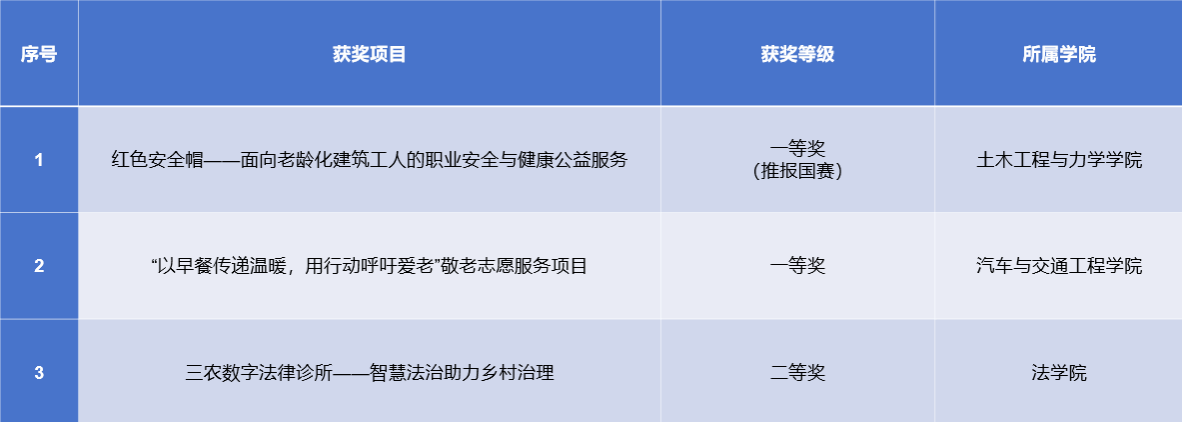 此次大赛以“志愿新时代 共筑中国梦”为主题,分为项目大赛、公益创业赛两个大类。比赛采用“项目资格审核+专家线上阅评+线下路演答辩”形式,涵盖关爱少年儿童、为老服务、阳光助残、乡村振兴、卫生健康、环境保护、节水护水、应急救援等14个领域。来自全省各地各单位的686个项目报名参赛,数量创历届大赛新高。大赛启动以来,校团委积极响应,组织师生全力备赛、精心打磨,共推荐6个项目参加比赛,最终3个项目入围路演答辩。