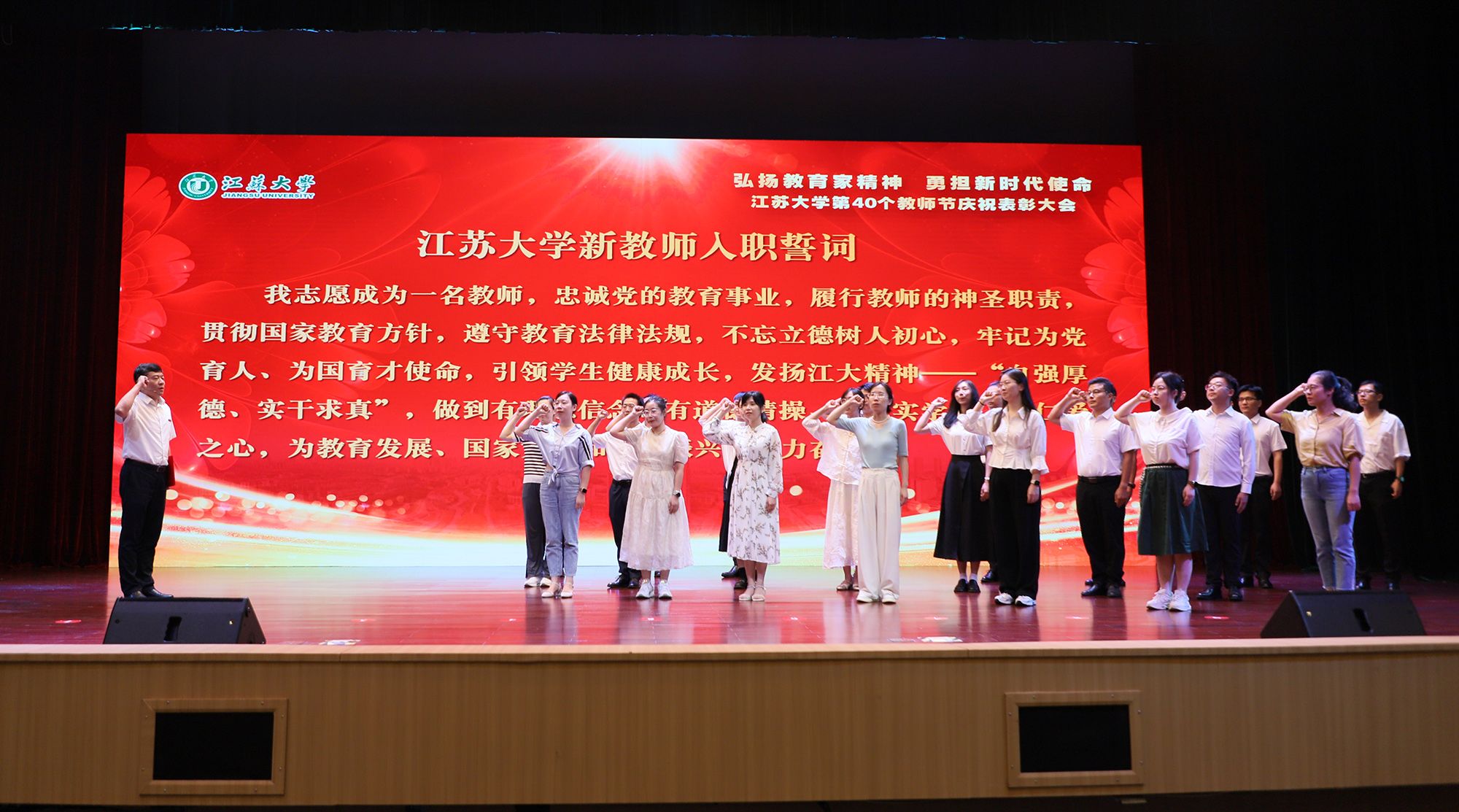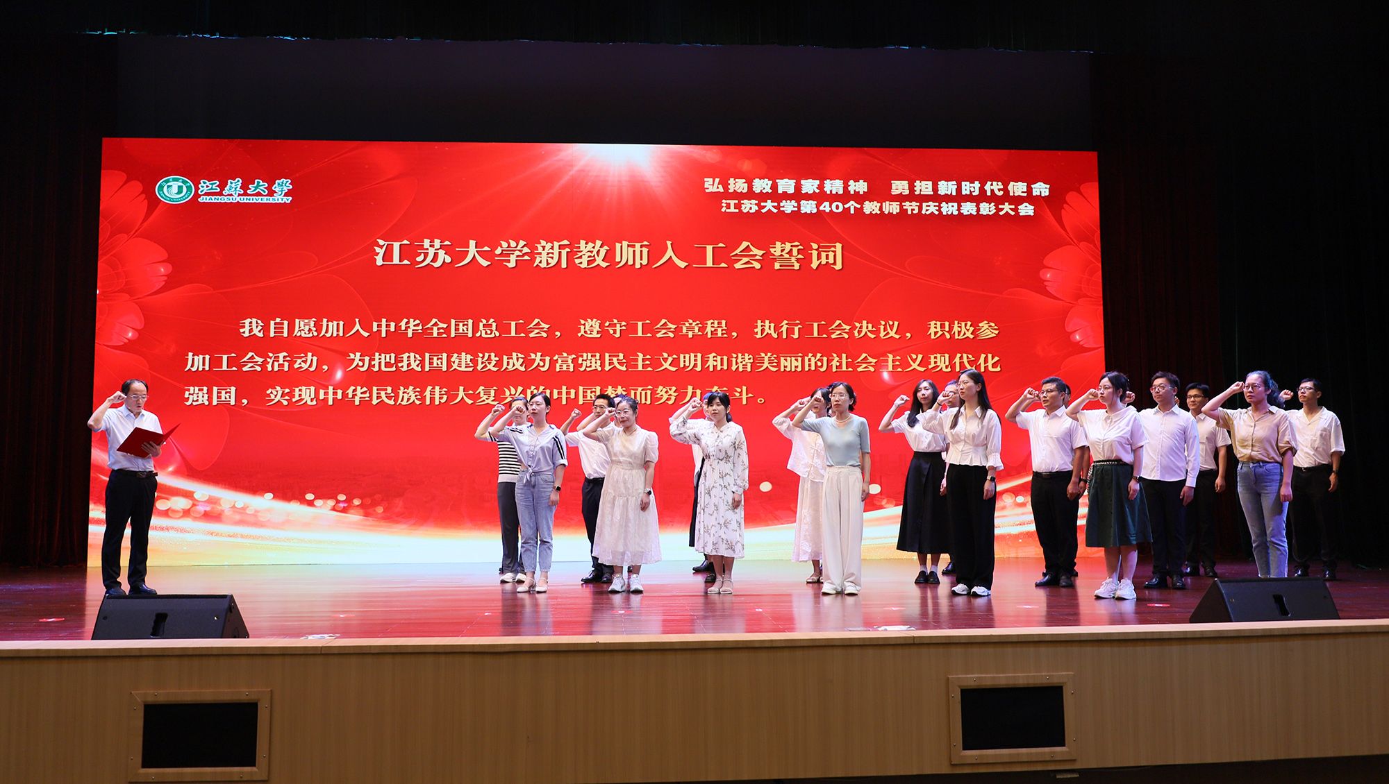 党委教师工作部部长王飞带领新教师入职宣誓,校工会常务副主席王善民带领新教师入工会宣誓。