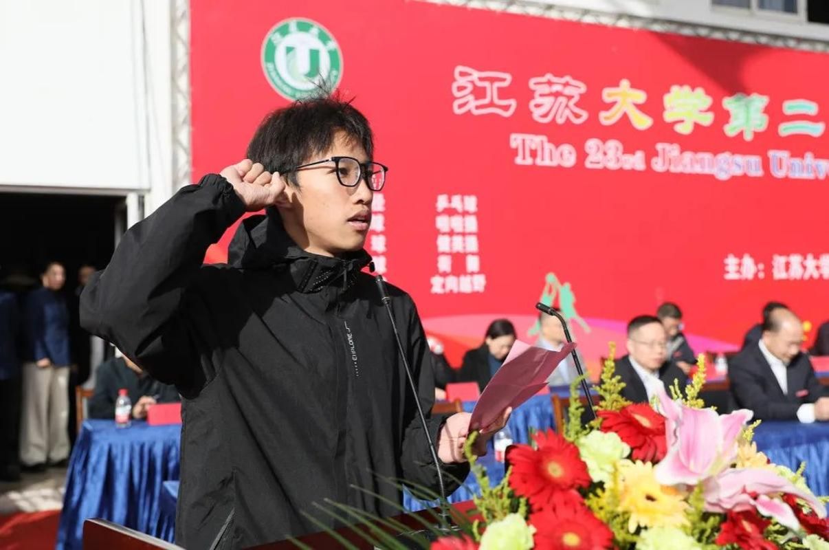 第22届全国大学生田径锦标赛男子甲组100米和200米金牌获得者、财经学院周健豪同学代表运动员宣誓。