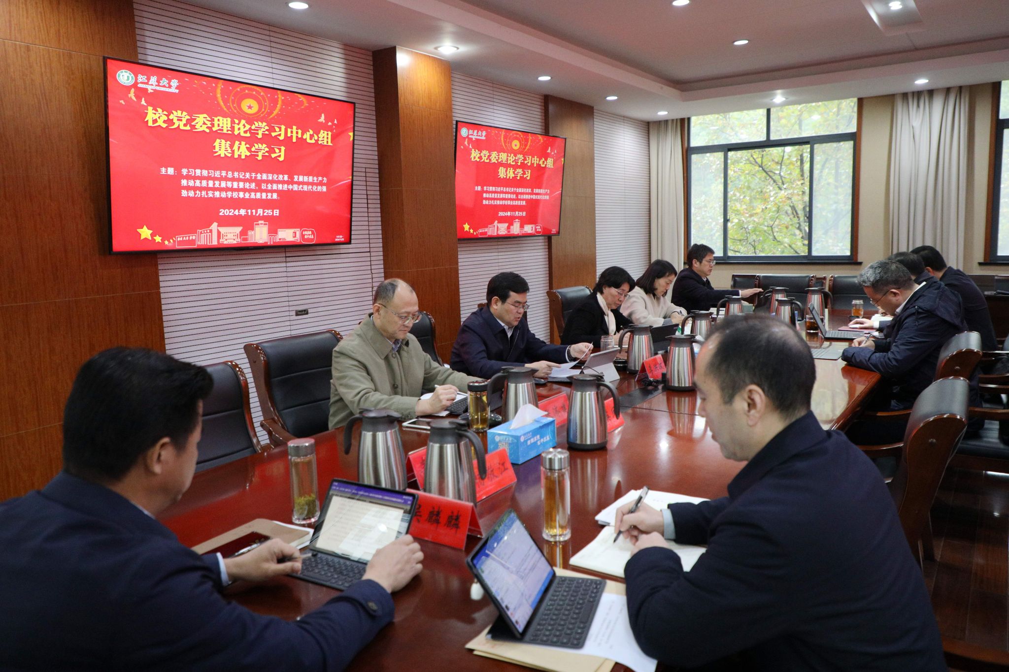 11月25日,校党委理论学习中心组在行政一号楼201会议室围绕学习贯彻习近平总书记关于全面深化改革,发展新质生产力推动高质量发展等重要论述开展集体学习。在校校党委理论学习中心组成员参加学习,集体学习由校党委书记李洪波主持。