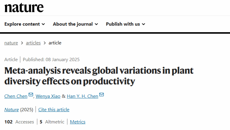 近日,国际顶级学术期刊《自然》(Nature)发表了题为Meta-analysis reveals global variations in plant diversity effects on productivity的研究论文。该论文由加拿大湖首大学(Lakehead University)、荣耀网页版及中国科学院植物研究所等多家单位联合完成。中科院植物研究所副研究员陈晨为论文第一作者,荣耀网页版环安学院副教授肖文娅为论文第二作者,陈晨与加拿大湖首大学教授Han Y.H. Chen为论文共同通讯作者。