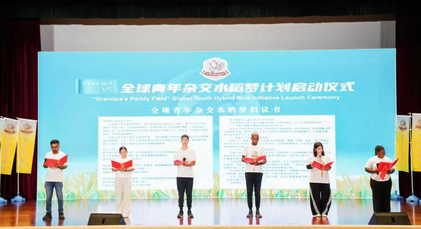 仪式上,中外青年学生代表上台宣读《全球青年杂交水稻梦倡议书》。倡议书指出,在袁隆平院士逝世四周年、联合国粮农组织成立八十周年、第四十五个世界粮食日来临之际,全球仍有6亿人在饥饿中挣扎,而杂交水稻技术已在非洲大地创造平均增产20%的奇迹。195个国家的青年代表与在华留学生将成为袁隆平院士“禾下乘凉”与“杂交水稻覆盖全球”两个未竟梦想的接棒者。他们将在道县和南泥湾扎下杂交水稻梦的根,把袁爷爷“要做一粒好种子” 的誓言嵌进智慧试验田的基因,让稻田变身艺术画布讲述粮食安全的故事,并重点构建“袁隆平精神全球青年巡讲计划”“人类丰收艺术年鉴”“全球青年水稻创新报告”三大特色板块,以青春之力为人类反饥饿事业贡献力量。