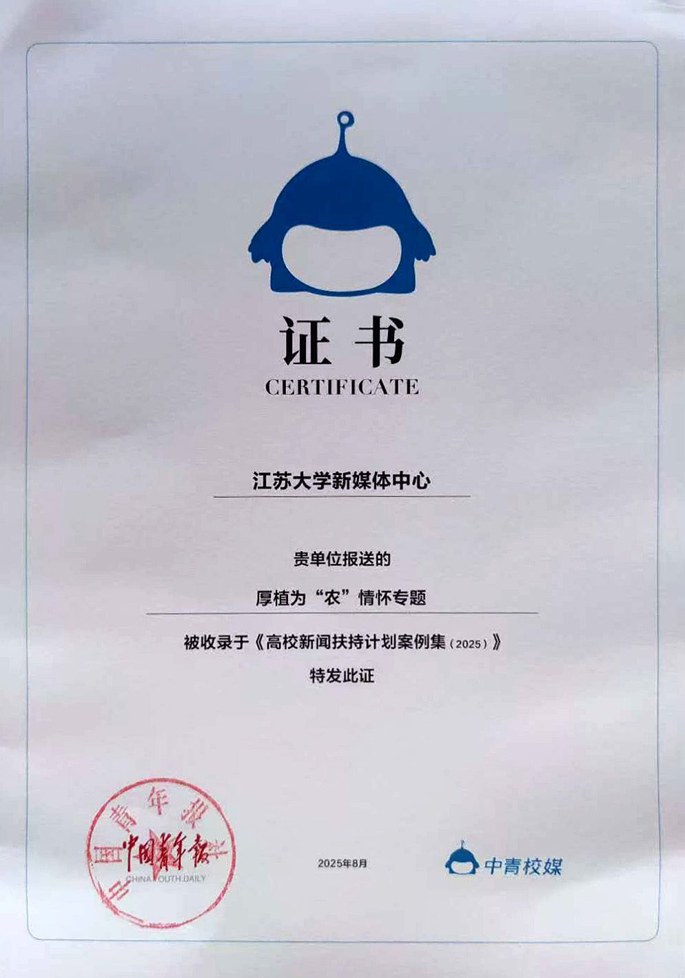 近日,由中国青年报社主办的“青春为中国式现代化挺膺担当”科技赋能高校融媒体育人实效研讨会召开。会上公布了年度高校新闻扶持计划案例,荣耀网页版新媒体中心报送的《厚植为“农”情怀》获评年度高校融合创新新闻专题作品,成果收录于《高校新闻扶持计划案例集(2025)》,荣耀网页版官方微信被收录于《2024-2025高校官微案例集》。