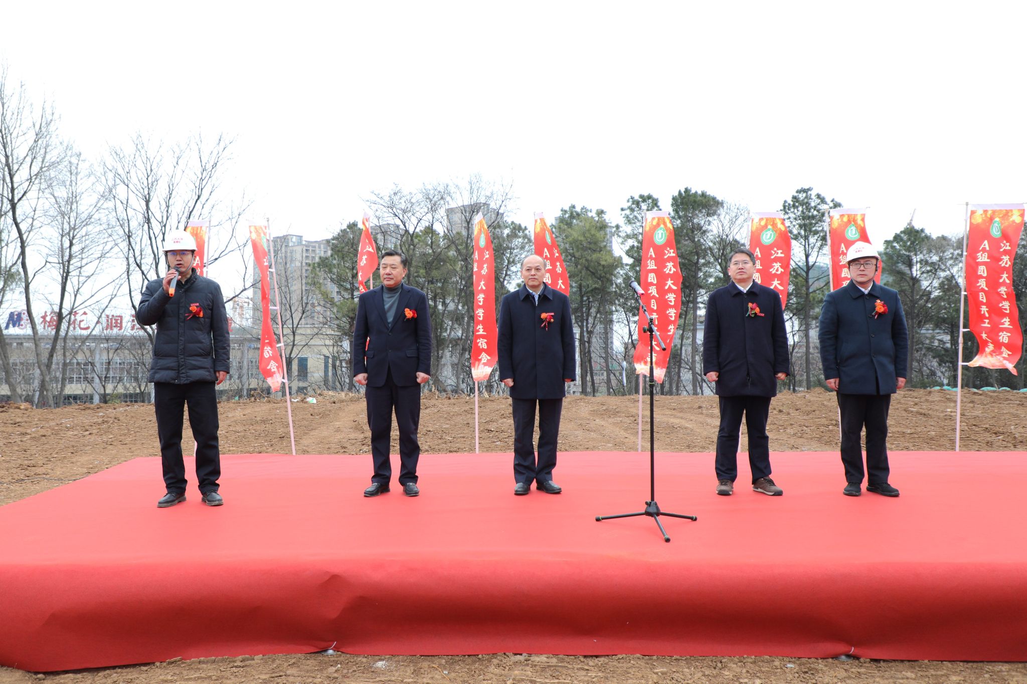 邹小波宣布学生宿舍A组团项目开工,校领导与各参建单位代表共同为学生宿舍A组团奠基。