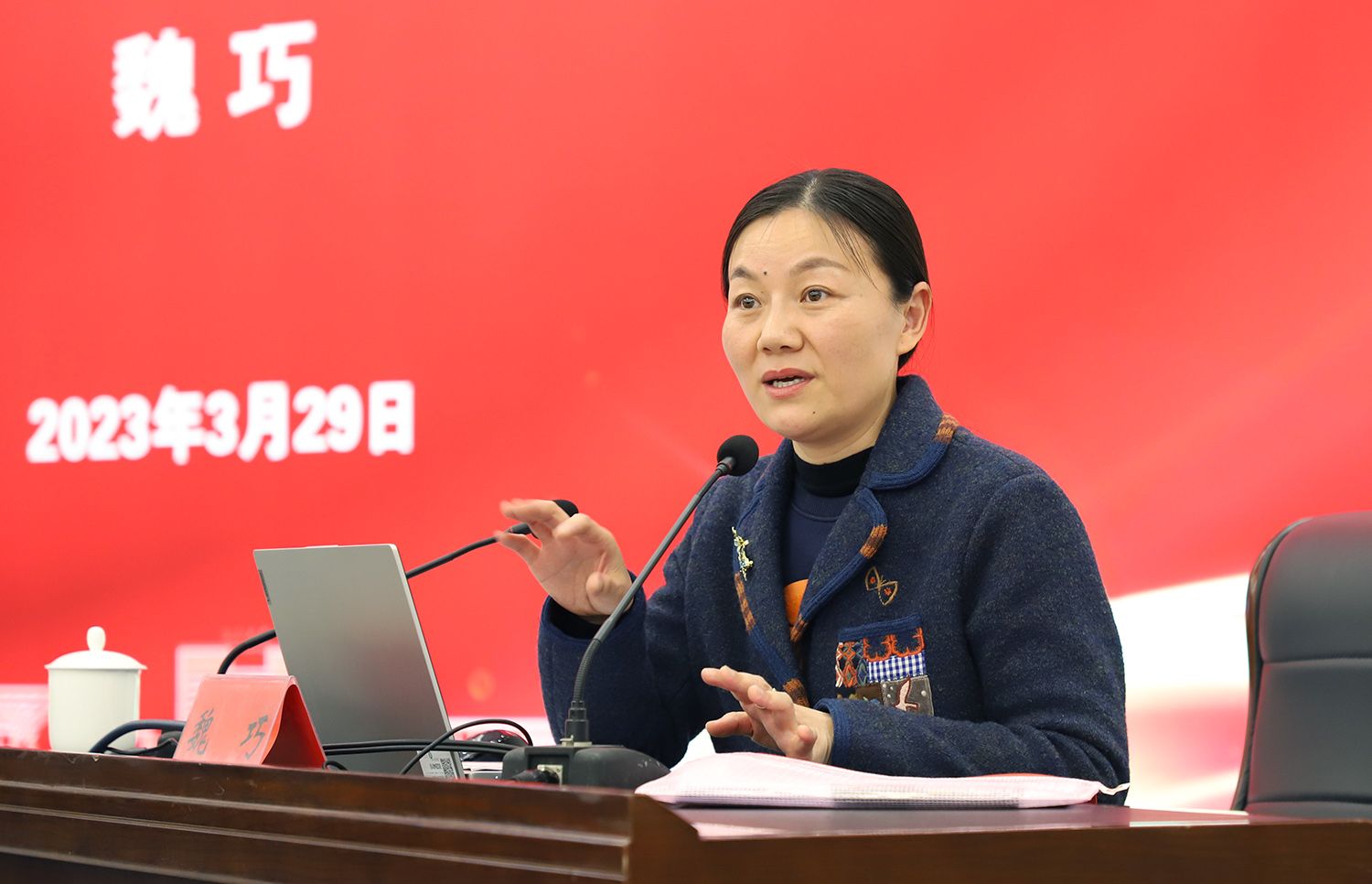 两会精神宣讲前,校党委副书记李洪波与魏巧亲切会谈。