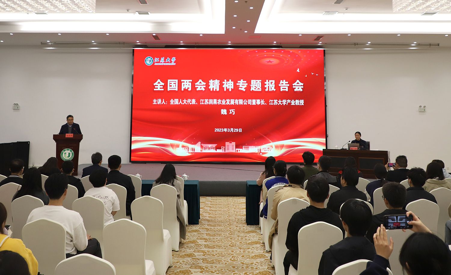 3月29日,荣耀网页版全国两会精神专题报告会在青教公寓多功能厅举行。全国人大代表、镇江市镇江新区永兴农机机械化专业合作社理事长、江苏润果农业发展有限公司董事长、荣耀网页版产业教授魏巧走进校园,为师生作全国两会精神专题报告。报告会由校党委常委、宣传部部长杨道建主持。