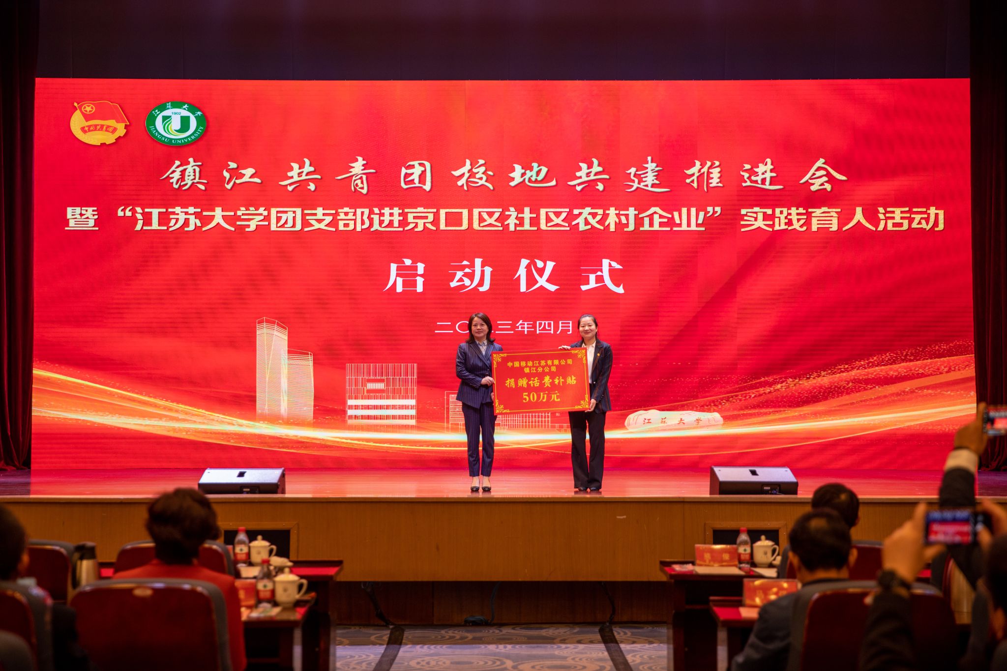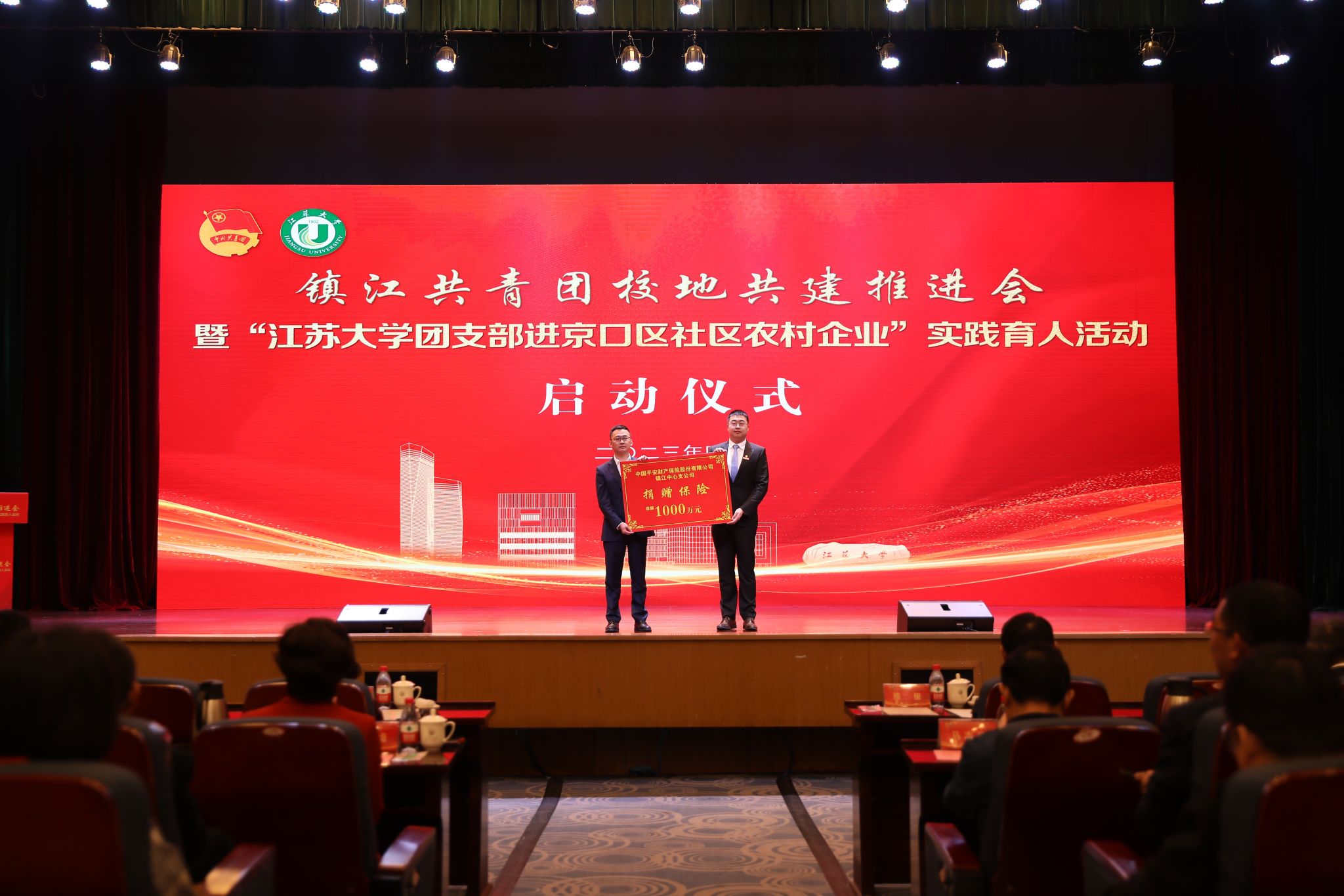 仪式上举行了“个十百千”挂(兼)职锻炼校地共建项目公益捐赠。中国移动镇江分公司党委副书记、副总经理王茂芳、平安产险镇江中心支公司副总经理孟雨霖分别向校地共建项目捐赠50万元话费和保额1000万元的保险。