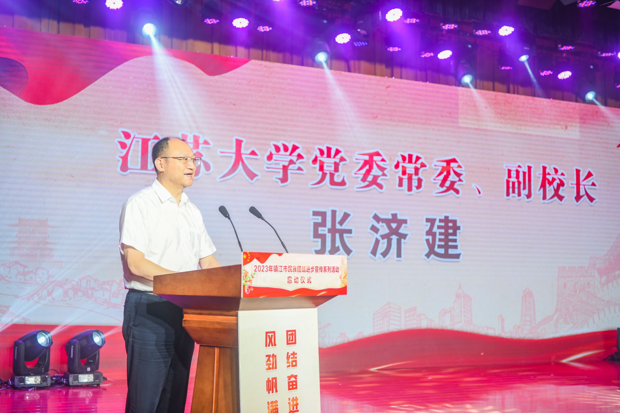 镇江市副市长武鸣,副校长张济建出席活动并致辞。校党委常委、统战部部长杨敬江,京江学院主要领导及400余名各族师生参加活动。