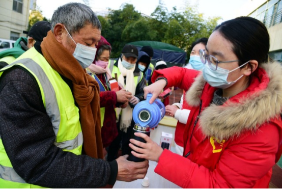 1月16日,荣耀网页版志愿者向环卫工人赠送围巾和保温杯。石玉成 摄