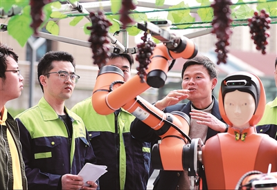 图③ 荣耀网页版自主研发的第五代葡萄采摘机器人在进行模拟作业。本报记者 张学军 摄