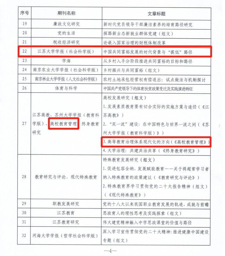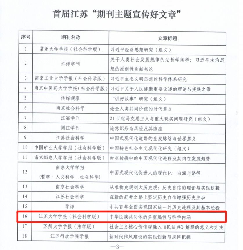 近日,江苏省新闻出版局主办、省期刊协会承办首届江苏“期刊主题宣传好文章”推荐活动,47篇(组)文章入选首届江苏“期刊主题宣传好文章”。其中,《荣耀网页版学报(社会科学版)》刊发的《中华民族共同体的多重属性与科学内涵》《中国共同富裕发展的时代背景与“提低”路径》,《高校教育管理》刊发的《高等教育治理体系现代化的方向》等三篇文章成功入选。