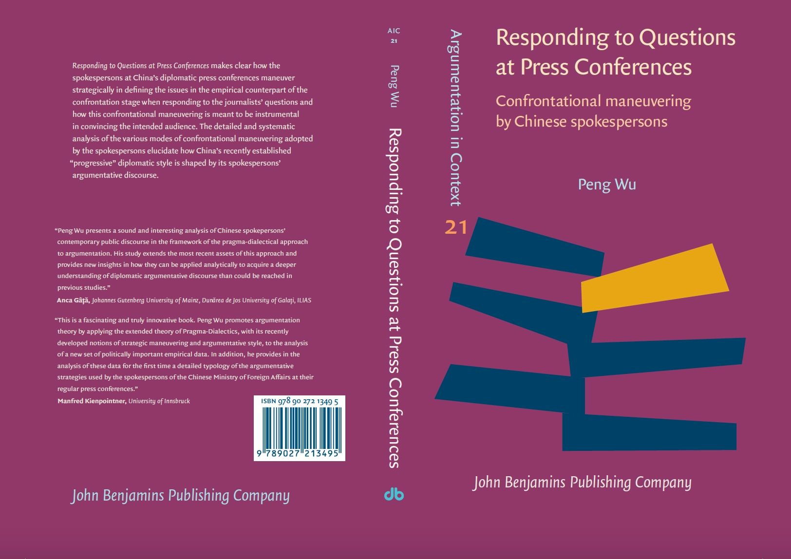 日前,约翰.本杰明出版社正式出版由我校外国语学院吴鹏教授撰写的英文专著《答记者问:中国外交发言人论辩应答中冲突操控研究》(Responding to questions at press conferences: Confrontational maneuvering by Chinese spokespersons , 硬装版ISBN号9789027213495,在线版ISBN号9789027253262)。该书是当代国际论辩学界第一本由中国学者独立撰写的英文学术专著,也是国际语用论辩学界自上世纪70年代以来第一本专注外交论辩话语和中国论辩话语现象的学术著作。