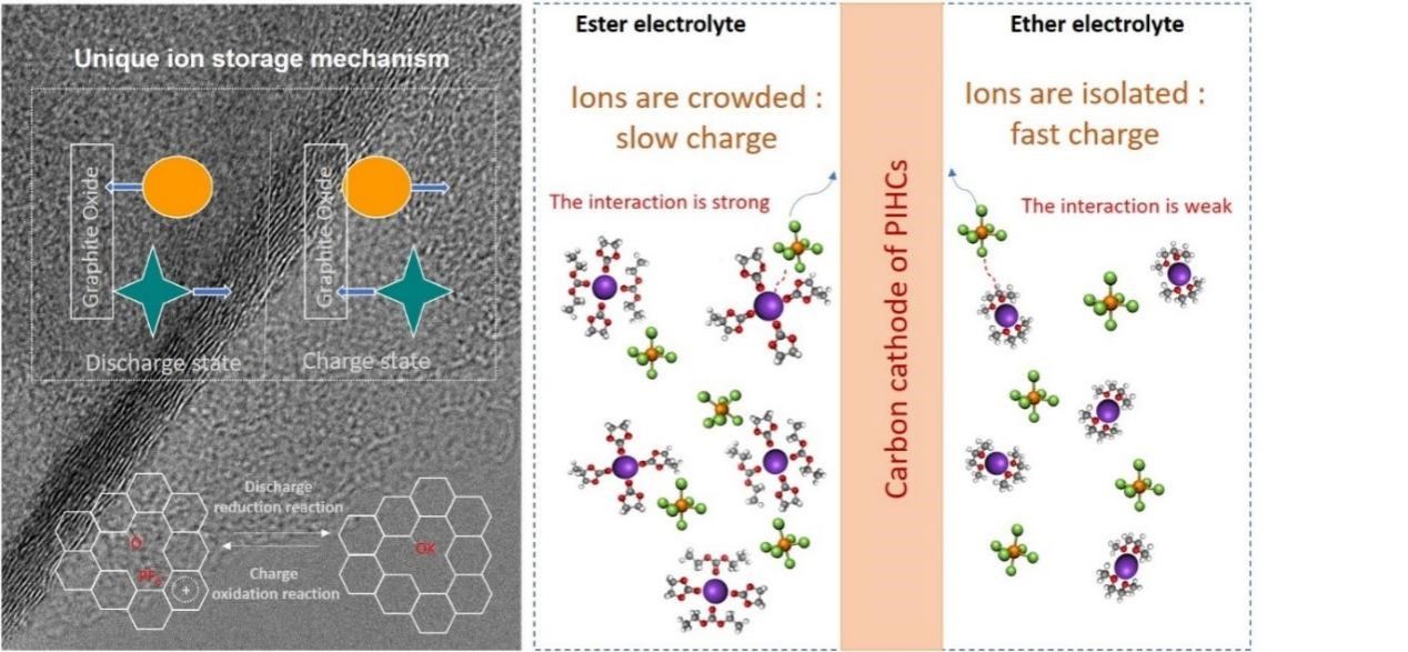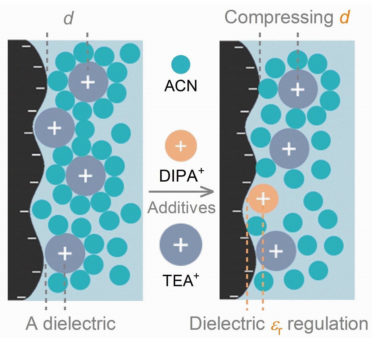 先进制造与现代装备技术工程研究院梁红玉副研究员团队在国际知名期刊Advanced Functional Materials上发表文章,提出一类兼容商用电解液的新型有机铁电盐电解液添加剂(如高氯酸二异丙胺,DIPAP)。添加剂中DIPA+与共性离子竞争中可更接近碳电极表面,压缩界面双电层中有效电介质层的厚度和/或减缓其相对介电常数的衰减。仅添加1wt%的DIPAP可获得21.6-45.8%的电容增量(同时保持理想的倍率性能)。该研究为挖掘现有碳电极-有机电解液体系的剩余潜力提供了新思路。