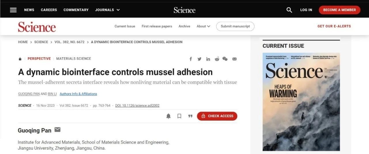 潘国庆教授联合苏州大学医学院李斌教授在Science上合作发表前瞻性文章,指出贻贝等生物所涉及的动态生物表界面有望为当前生物材料的组织细胞兼容性改善提供可行方案,并展望了相关结构的仿生构建在可拆卸植入材料(如生物传感器和医疗植入物),甚至在动态脑机接口等跨学科交叉领域的广阔应用前景。